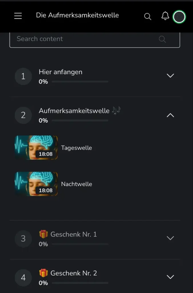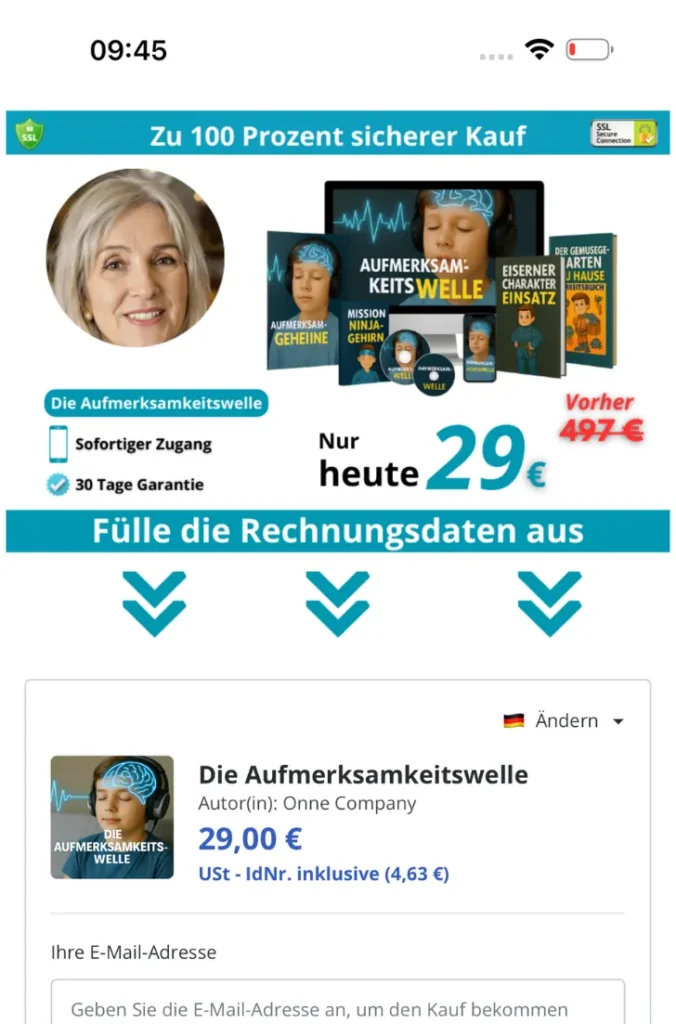 Sobald du den Kauf abgeschlossen hast, erhältst du sofort zwei E-Mails. Die erste enthält die elektronische Rechnung deiner Bestellung und die zweite die Zugangsdaten, mit denen du dein Passwort für die Plattform festlegen kannst, auf der du Zugriff auf die Aufmerksamkeitswelle erhältst.